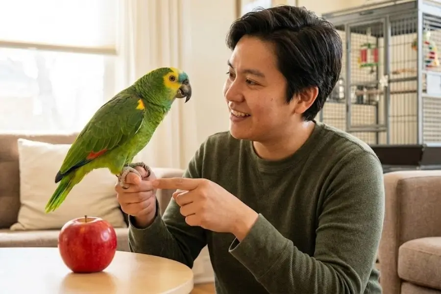 – Use an “Excited” Tone: Birds are naturally drawn to high-pitched, emotional tones (which is why many birds first learn to mimic women or children). Use a happy, exaggerated voice to say the target word.